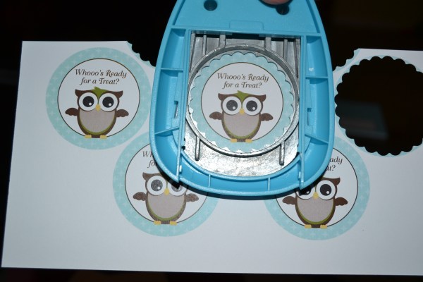 I printed the 2″ circle tags on 110lb cardstock and cut them out with a scalloped 2″ hole punch.