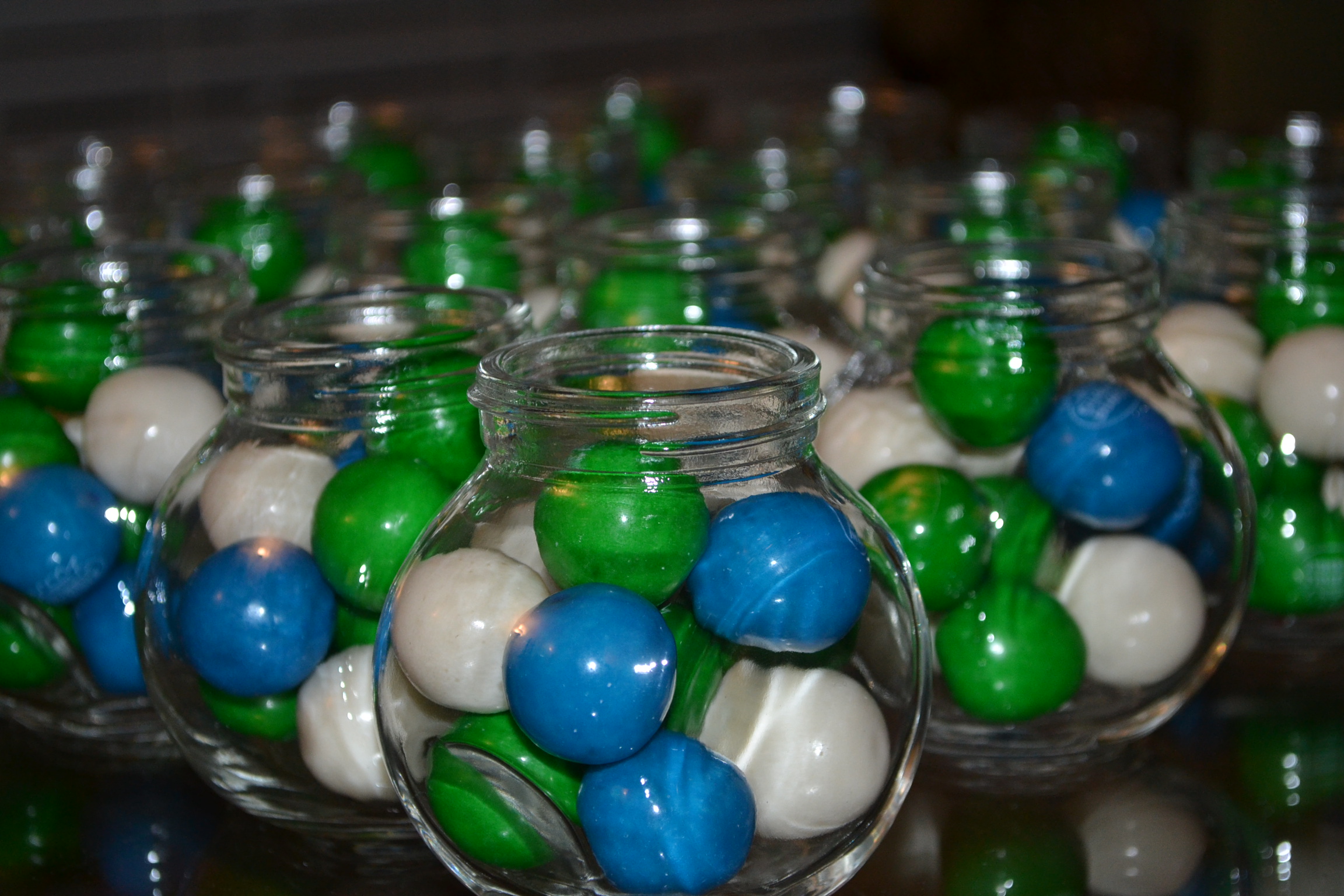 The 2″ circle tags I purchased on Etsy were a perfect match for the lids of the Ikea RAJTAN jars. With a little rubber cement glue (so it could be removed for use after the party), I adhered the tags. I then took the sorted blue, green, and white gumballs and carefully inserted them into each jar.