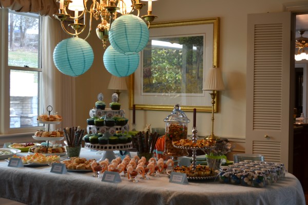 Not too shabby, if I do say so myself! Now that I have the favors figured out (first things first, after all) I could concentrate on the menu and other details. Lucky for me, my favorite color is ‘Tiffany Blue’ and I have a lot of party supplies in that color. Here’s how the drink table decor turned out (excuse the awful pictures, I had to take them in direct sunlight):