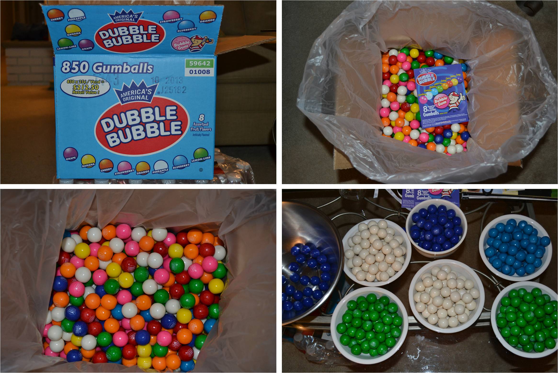 After about a week or so of shopping locally for for blue and green candy I decided to hit up Sam’s wholesale club. I found a 15lb box of double bubble gumballs for $19. It just so happened that the box had blue, green and white gumballs (among many other colors). I decided to buy the box after an exhausting week long search for blue and green candy. I got out some rubber gloves and sorted through the 15lb box of gumballs and separated the blue, green, and white balls.
