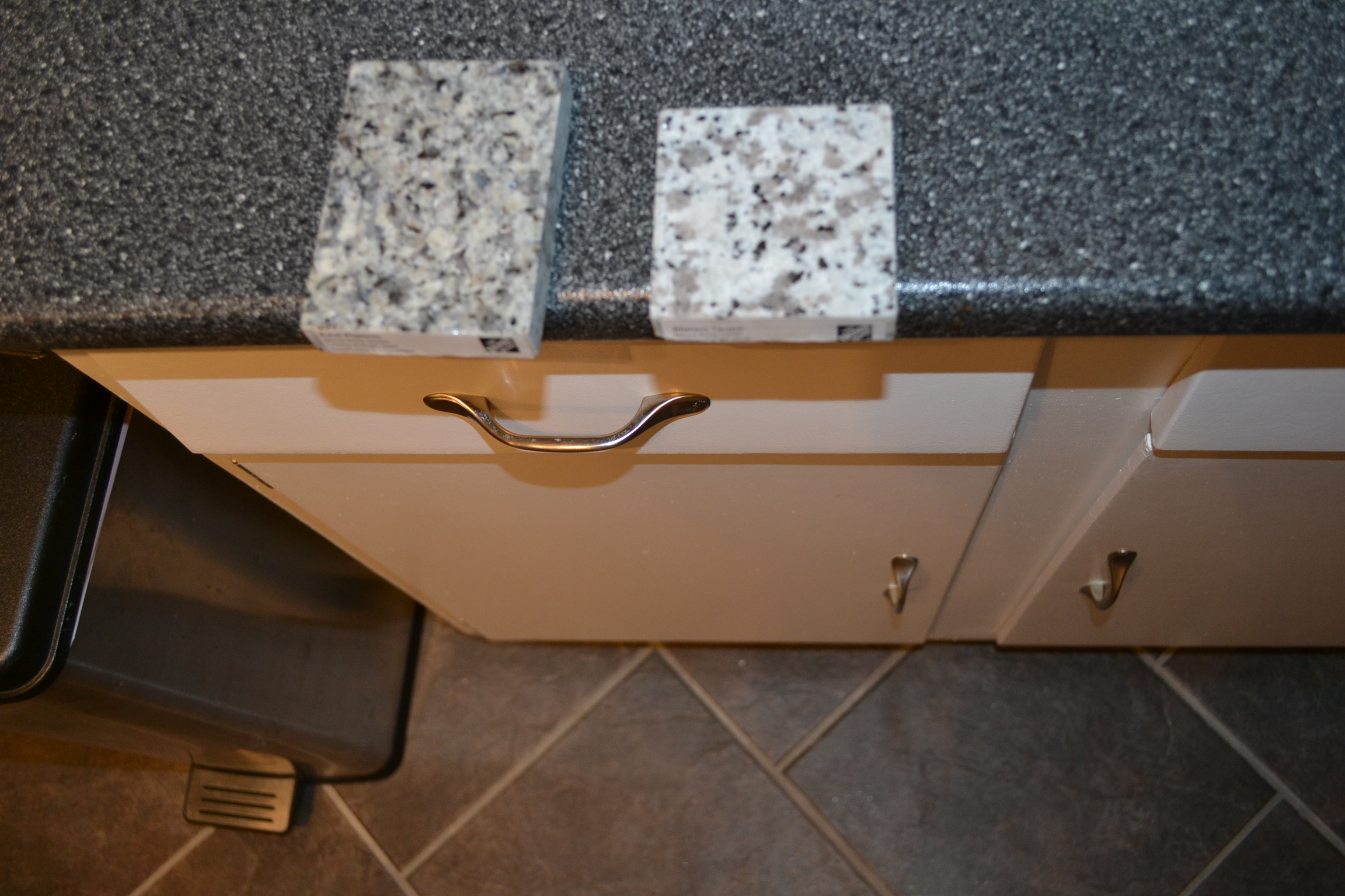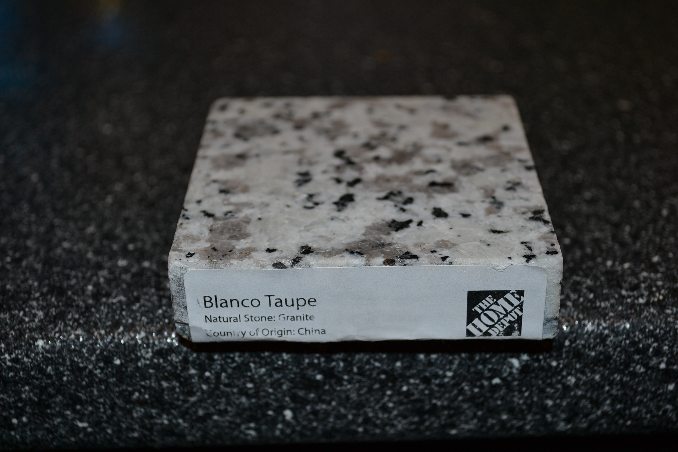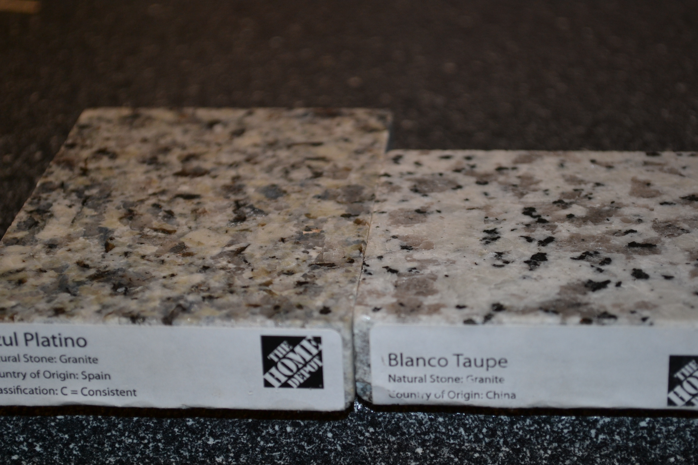 Friday we went for the slab view, just to make absolutely certain that this was the top we wanted, and it was perfect! We actually set a date for the install during the slab view. If I told you the exact date something will go terribly wrong, so I have opted to keep that a secret. Here is a picture of the Blanco Taupe granite against the original Azul Platino.