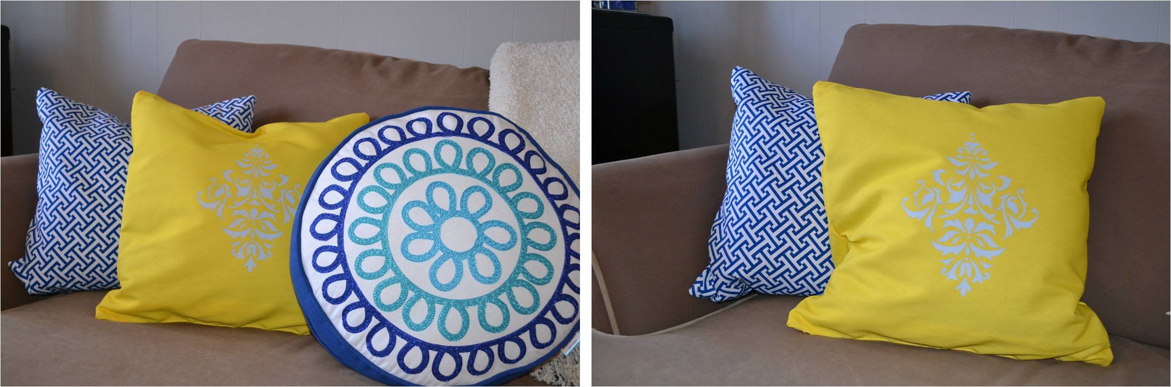 My freshly painted yellow damask pillow really isn’t that yellow. She just doesn’t photograph that well. Damn her. It’s really more of a subtle (but bright) yellow. She definitely gives that basement the little pop it needed.