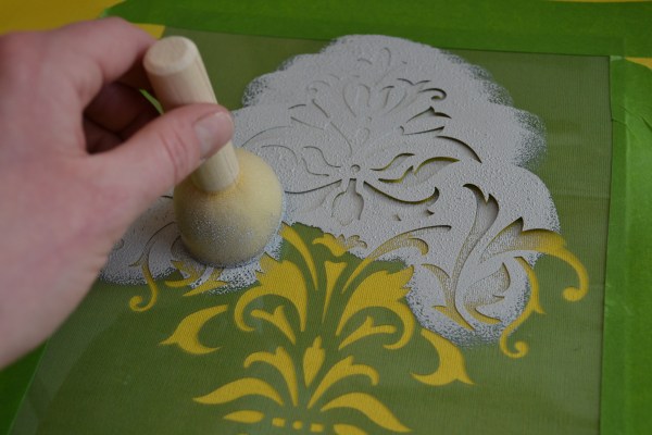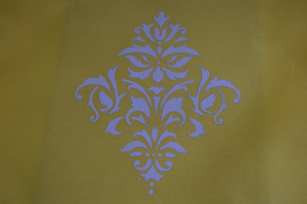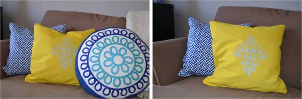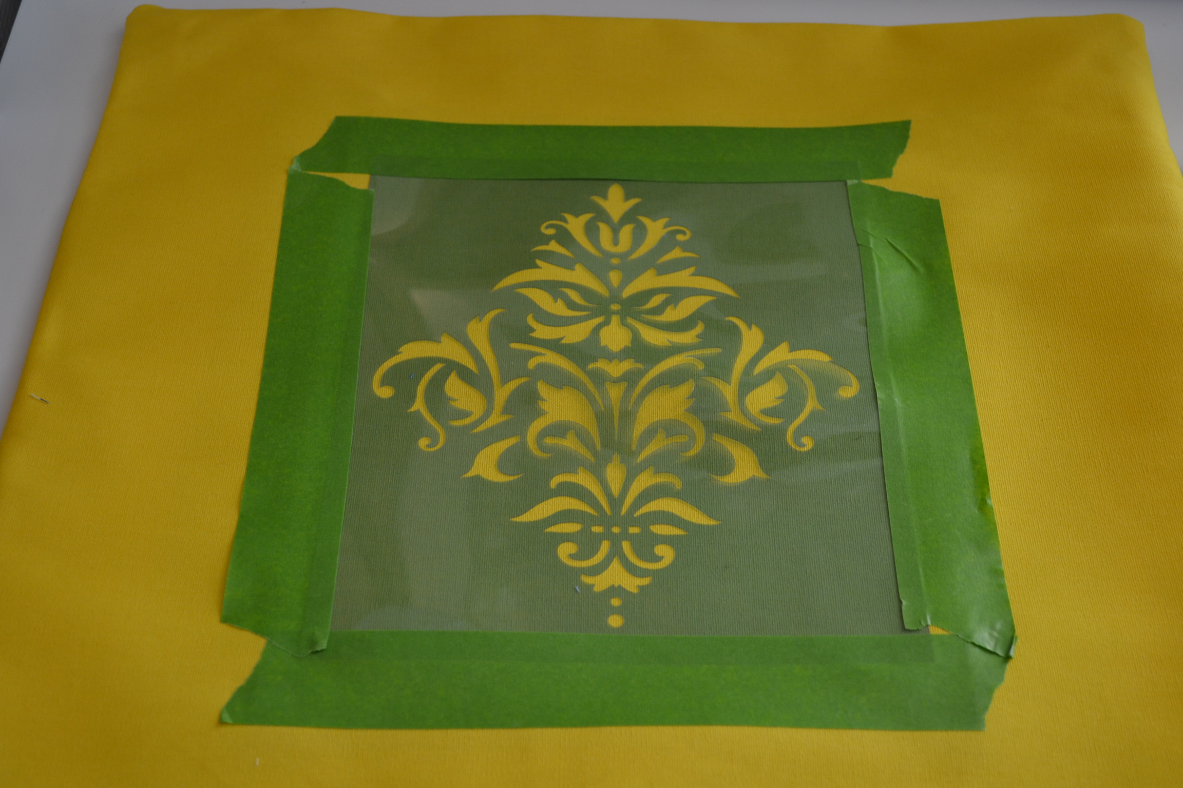 On my yellow pillow I taped the laser cut stencil to the center of the fabric (after measuring to find the center) using green frog tape.