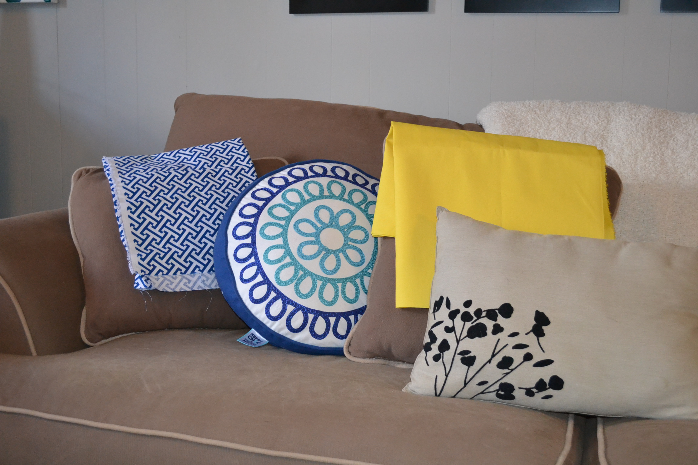 The Hobby Lobby had some really cool fabric, but not much in my color scheme. Boo. I ended up get a blue and white geometric fabric and just a solid yellow. My mother suggested painting the solid yellow fabric in a pattern. I liked that idea even though I had never painted fabric (I don’t think puffy paint on a sweatshirt in 1988 counts). With the intention to paint the yellow fabric, I bought both pieces for a total of $6 bucks, using 2 coupons. Here are the swatches I ended up with: