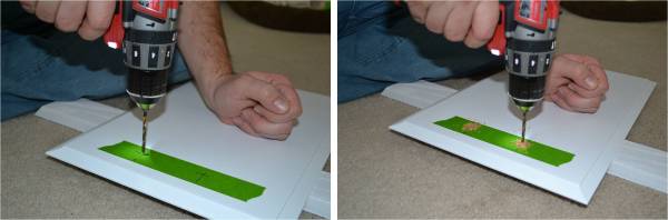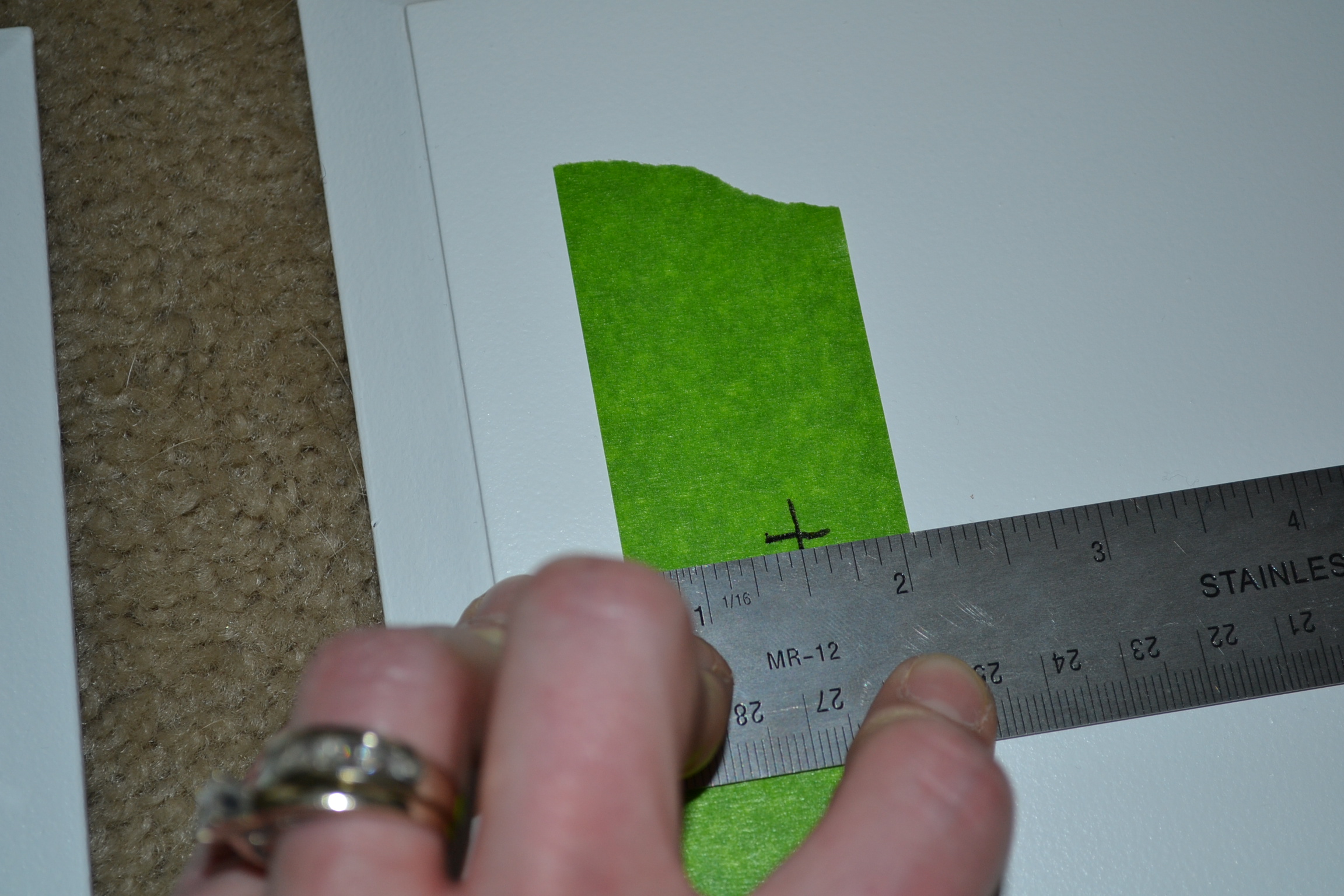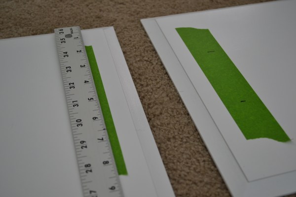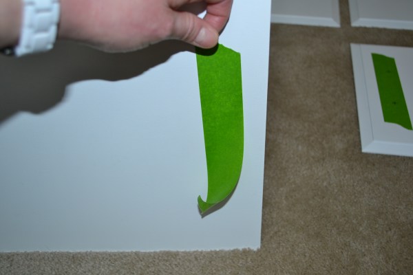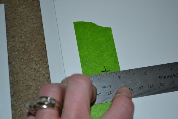 After Ryan got the cabinets hung I started getting the cabinet doors ready for their new pulls. I filled the previous holes with wood putty and sanded them last week. Once the cabinets were primed and painted those original holes became invisible. The new pulls are going to be placed in the center of the door. If you tape the spot where you are drilling it prevents splitting in the wood. So I got out the Frog Tape and figured out my measurement for the new holes.