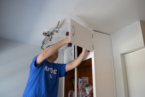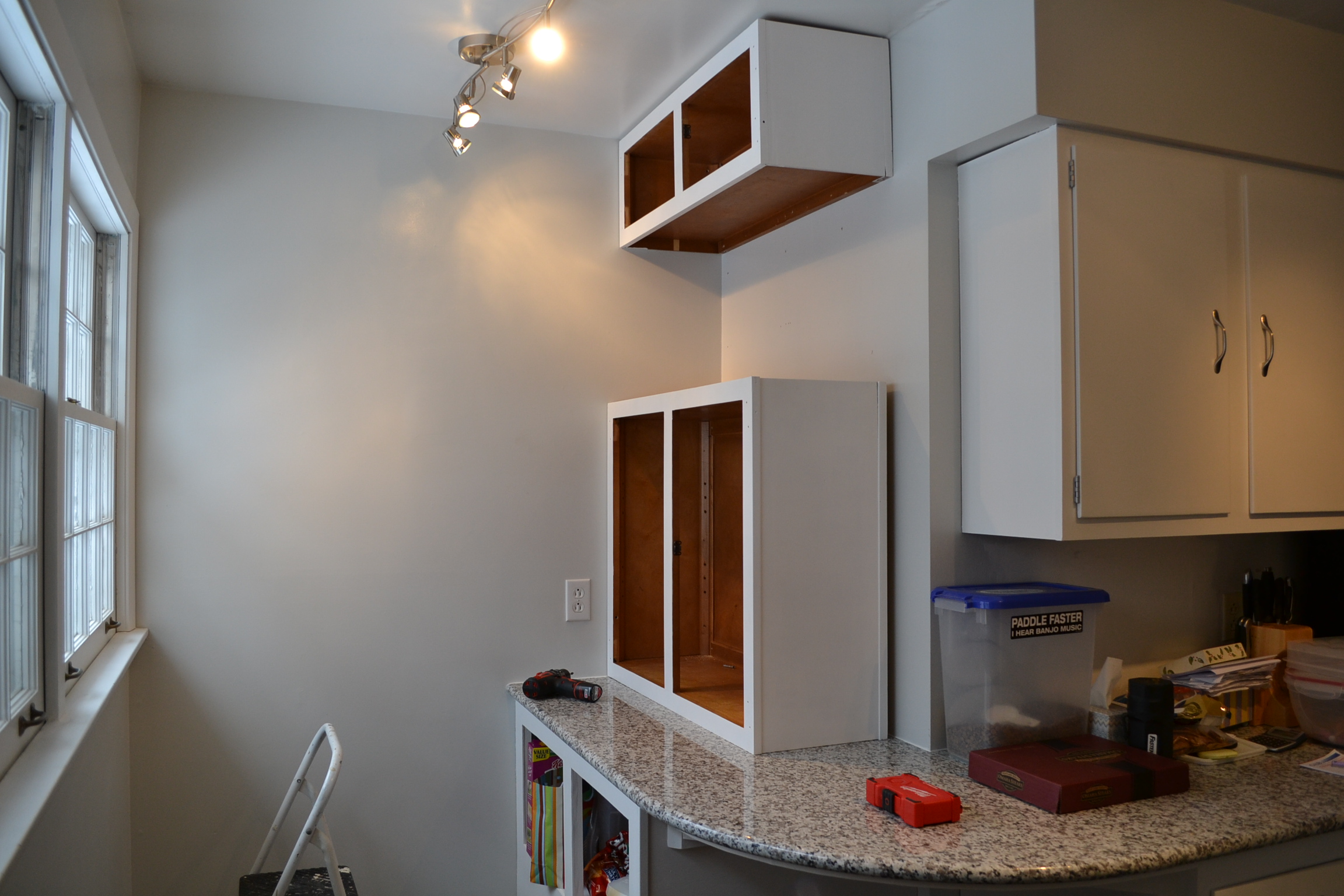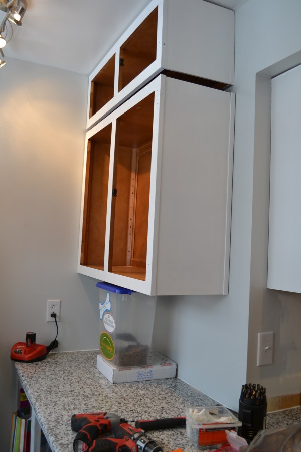 Ryan stacked a few boxes between our dog-food-bin to hold the ‘big’ cabinet up.