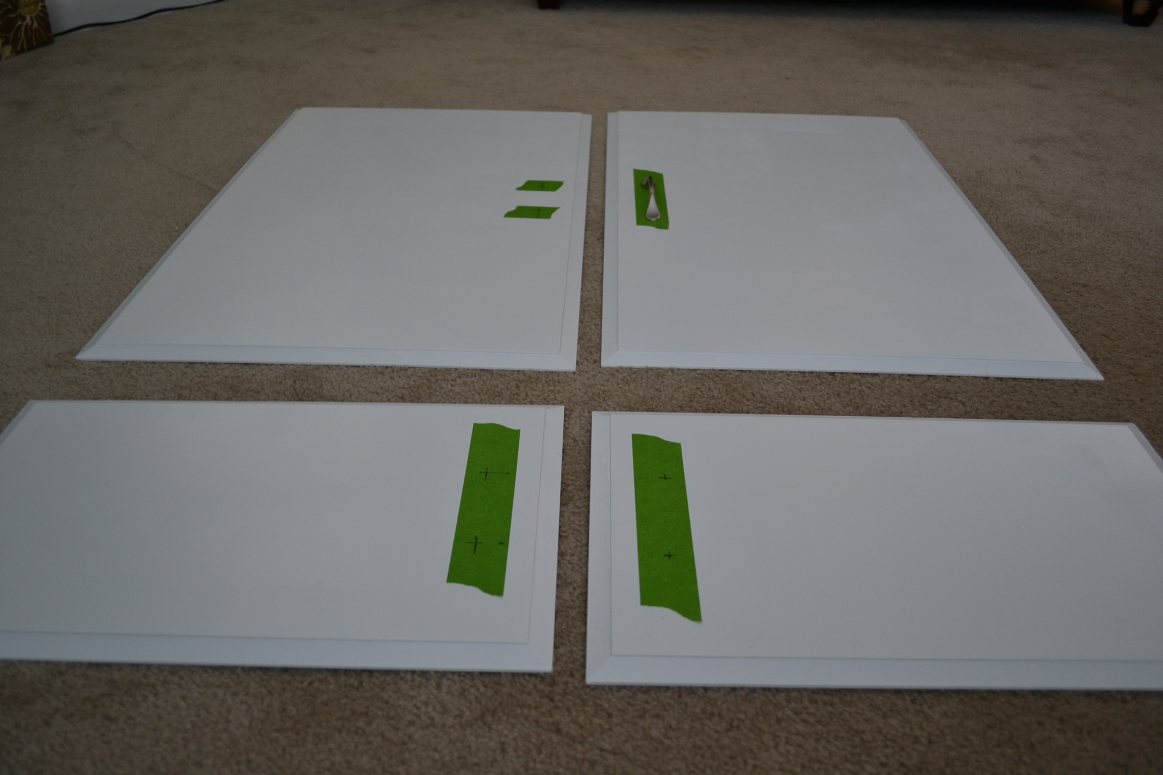 It’s a good thing I doubled checked my measurements because I was actually off by a half inch on one door. That would have been a wonky handle! After I re-marked my spot on that door, all four were ready to be drilled.