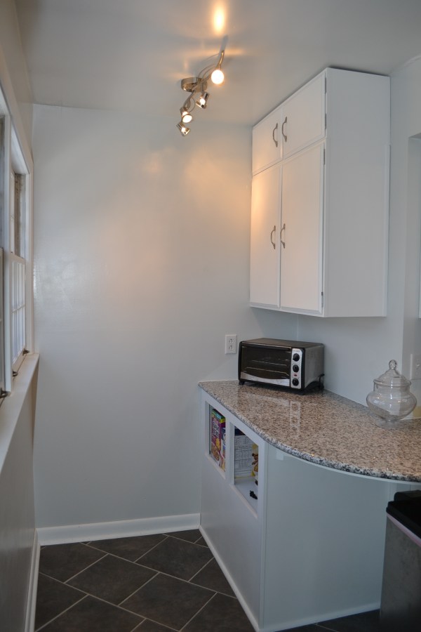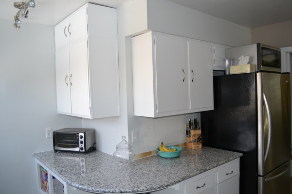 Finally we have working upper cabinets to our kitchen countertop addition. It took two days (both Saturday and Sunday) to get it to completely finished but we are both totally stoked to be “Hangin’ Tough”. Here’s what the kitchen looks like with the new cabinets all pretty and white.