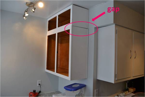 After Ryan got the Molly’s in, together we installed the cabinets. Okay, I just held them up, he did the actual installing. Here is a pic of the two cabinets mounted to the wall. As you can see there is a gap on the right where the two cabinets meet up. I will fill this space will wood filler and sand it smooth. After a few coats of glossy white paint you will never know this gap existed, just like the holes on the cabinet doors.