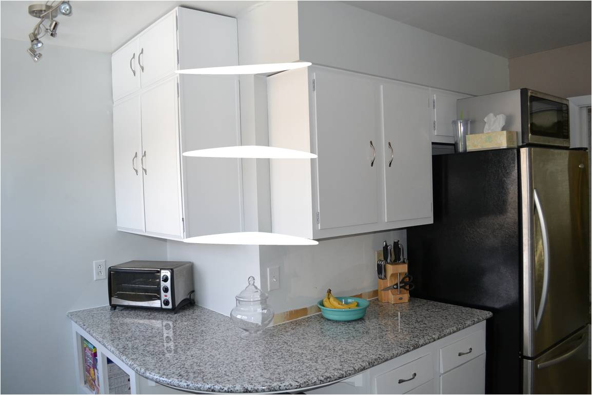 Don’t forget we still have the shelves to cut and hang between the two cabinets to tie it all together. I did a photoshop mock-up so you can get a feeling of what that will look like. The open air shelves will have a curved radius to mimic the granite below. (We hope to start on that this weekend).