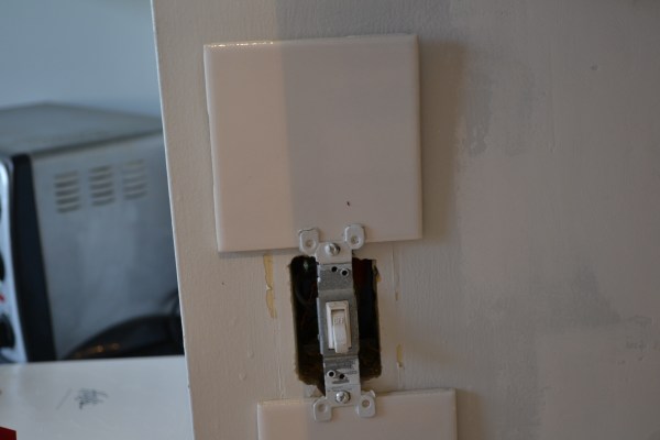 Next, we turned the corner and started on the adjacent wall. This wall has several electrical switches on it. Ryan carefully pulled out the switches so the tile will fit beneath and the outlet over will lay nicely on top.
