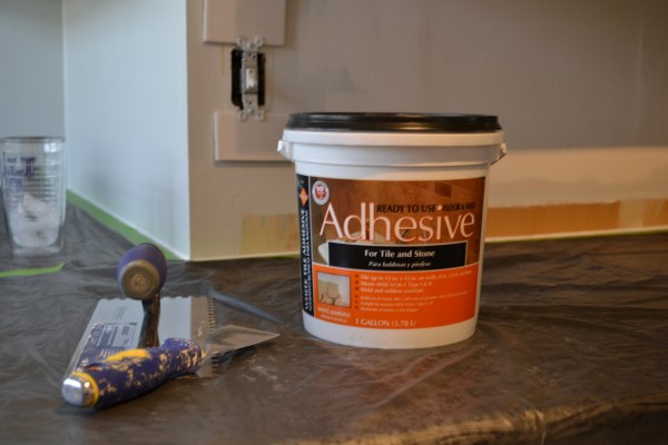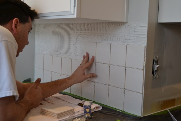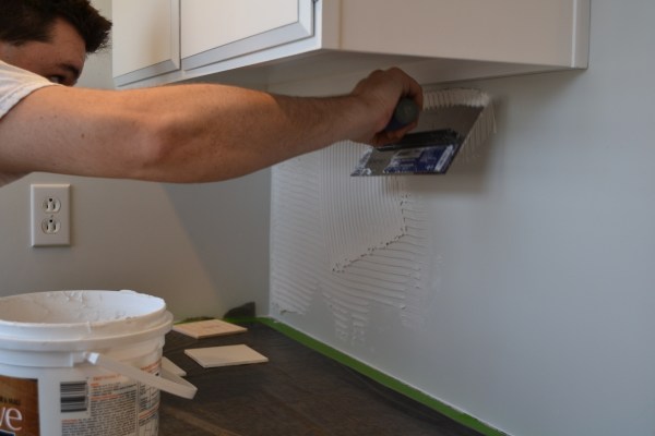 Once all 24 tiles were set on the main wall we were able to move to the opposite wall and repeat the process. This wall was mostly full size tiles, only the trim and edge pieces needed to be cut. We (that’s the Ryan part of ‘we) just had to calculate correctly where to start. It worked out almost perfectly that four 4×4 tiles fit under our cabinets. One tile needed about 1/8″ taken off so we decided to start at the bottom and just cut the top row since it would be hidden under the cabinets (much easier then trying to center ourselves like we usually do…what’s an eight inch between friends and a cabinet?) Ryan used his trowel to apply the adhesive to the wall.