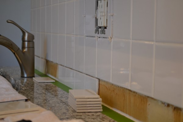 First we removed four existing tiles to the right of the sink. Our power outlet and disposal switch were not properly installed and the plate cover looked all wonky. We carefully removed the four tiles around the electrical unit so we could replace the tiles and pull out the switches to allow them to sit flush with the backsplash.