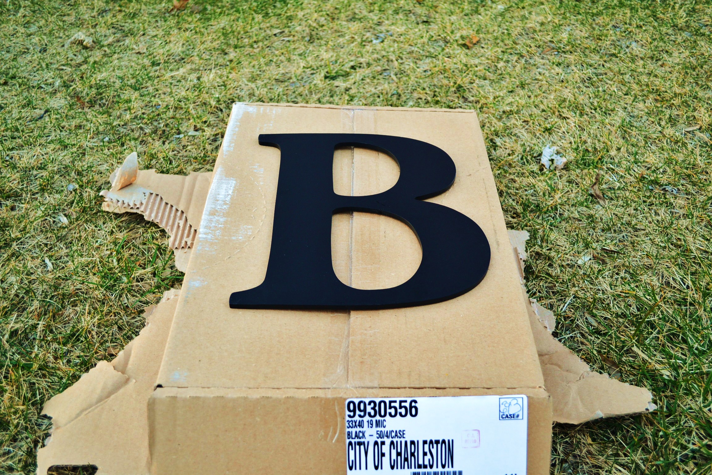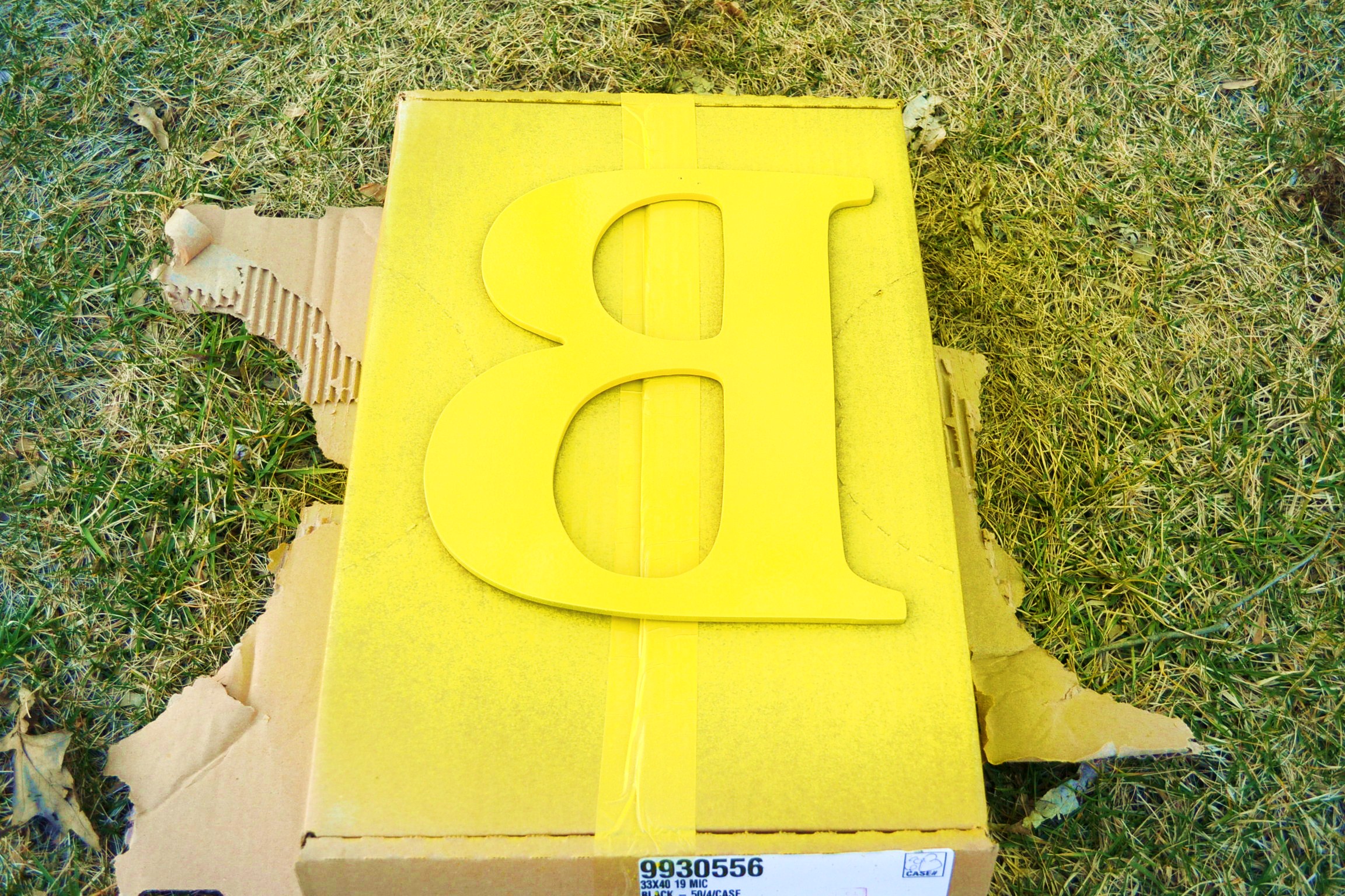 Still not knowing what would become of my letter B, I went outside with a can of yellow spray paint I found in our garage. I sprayed the back first so if there are any imperfections they will only be visible from behind.