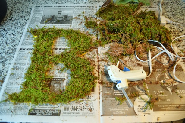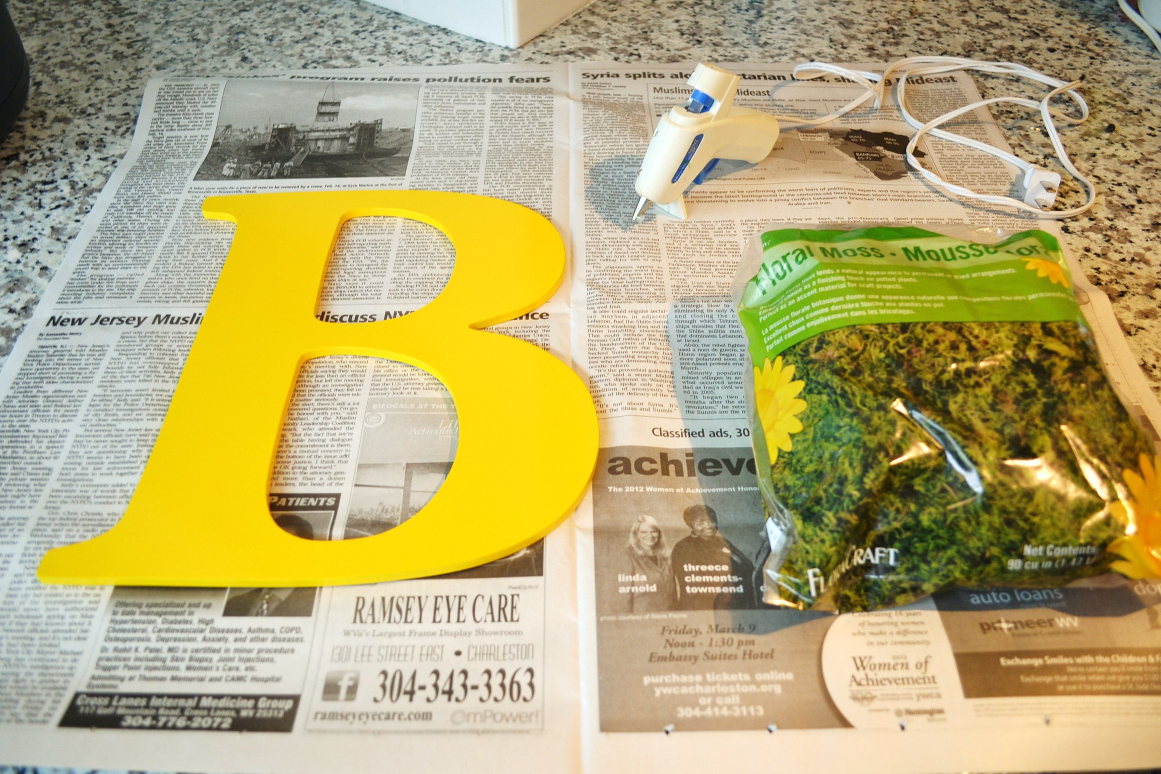 After several very thin coats of paint on both sides I was left with a very cheery yellow letter B. I allowed the letter to sit for a day or so to fully cure. My initial thought (no pun intended…haha) was to find some faux boxwood branches to cover it with but I was unable to locate anything of the kind in the Charleston area…whomp, whomp. I did, however, find some floral moss at Walmart for $2.50. I decided it was worth a whirl to see what kind of texture the moss would add to my letter B.