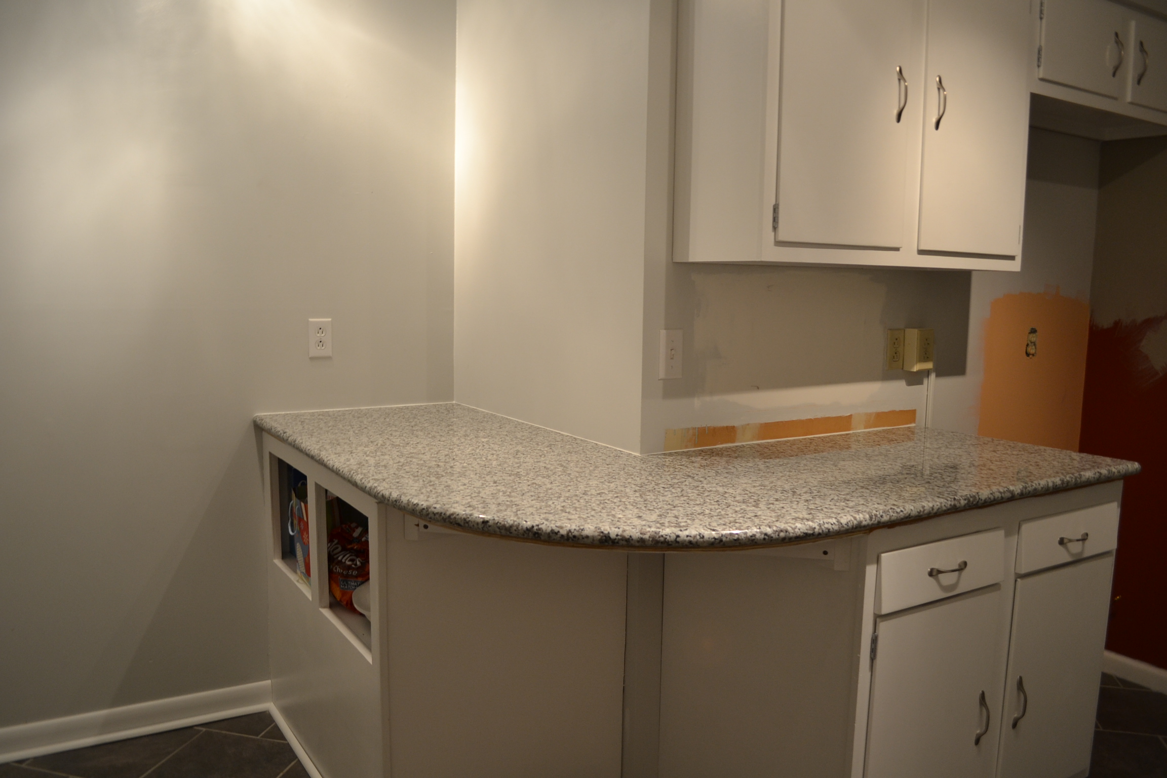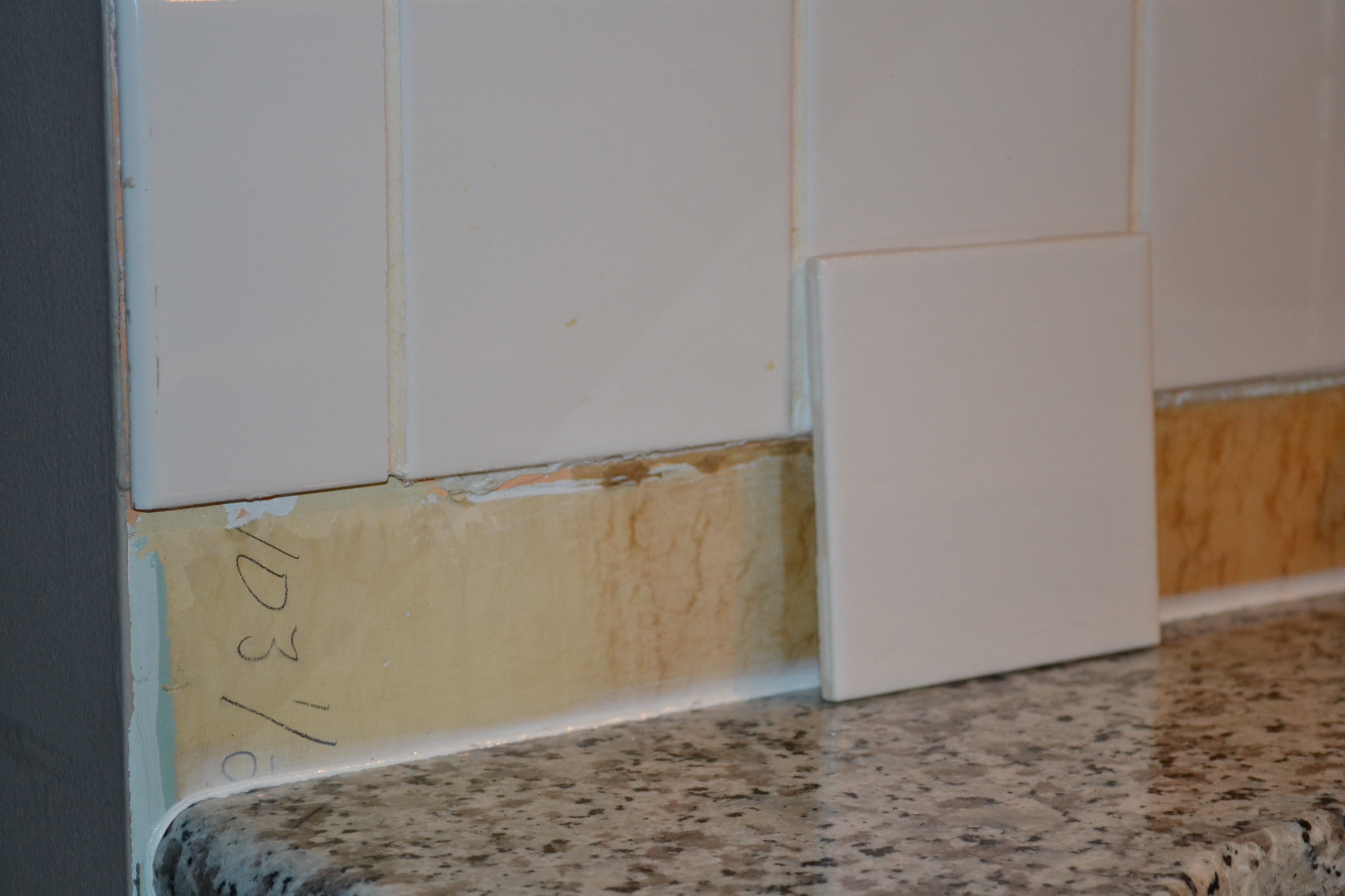 It’s held up pretty awesome. No scrapes, bruises, or stains. Once the granite was installed (mentioned here) we were left with a little gap between the new granite and old backsplash that looks like this: