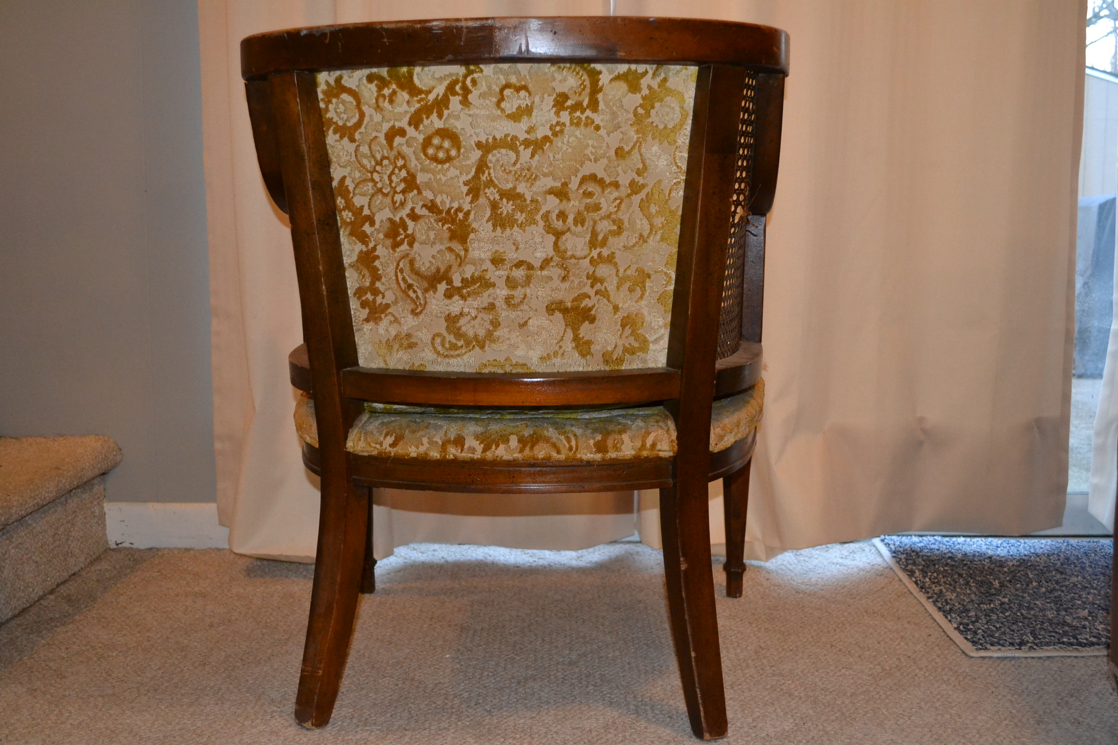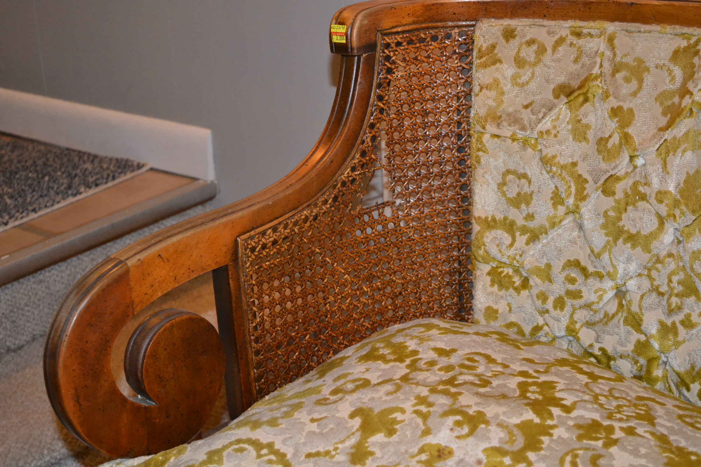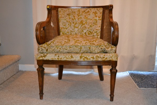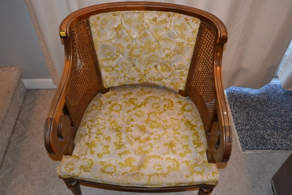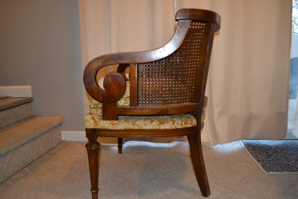 The chair has some awesome bones. I especially love the curved arms. The cane webbing is broken on both sides and will have to removed. Originally I planned to replace the cane but looking at it now I might be able to get away with just leaving it off, giving it a more contemporary look.