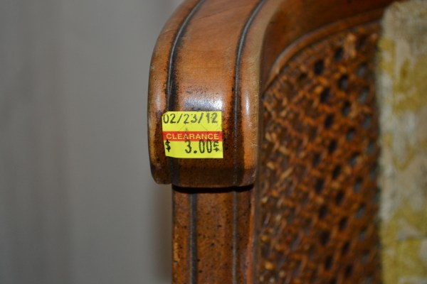 For the past few months I’ve had my eye on a certain classical chair. It had a $30 price tag on it which completely appalled me. It was full of broken cane webbing and the upholstery was grossly worn. The bone structure was awesome, which is why I continually contemplated buying it. Friday, on a random trip, that chair I had been pining was finally in the clearance area. I checked out the tag…three bucks??? seriously? It was mine. I wanted to buy it and pick it up on Saturday but because it was a clearance item they would not hold it for me. I figured I could totally get the chair into my trunk and just bungee it for the 3 blocks back to work. Not so much. That sucker seemed so much larger outside the store. Boy did I feel like a big idiot standing in the parking lot with a random chair. I immediately called my Re-Store co-hort, Kim, and she quickly came to my rescue with her SUV. We hauled that baby back to the office and Ryan stopped by to pick it up on his way home from work.